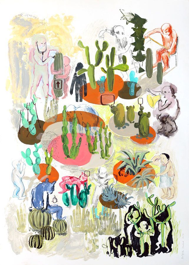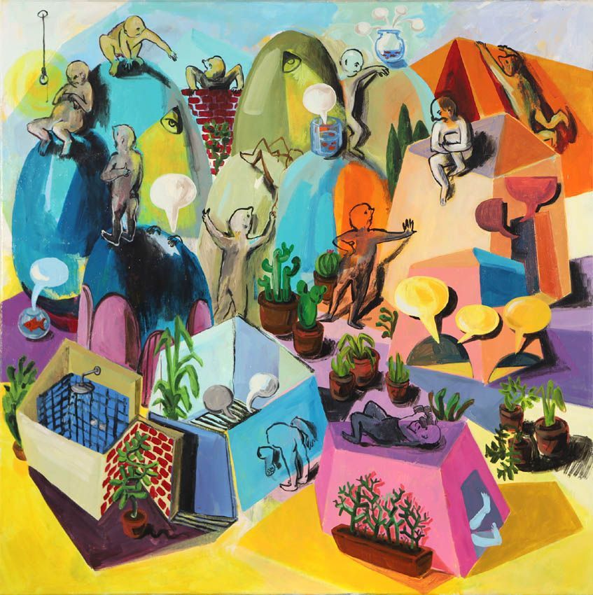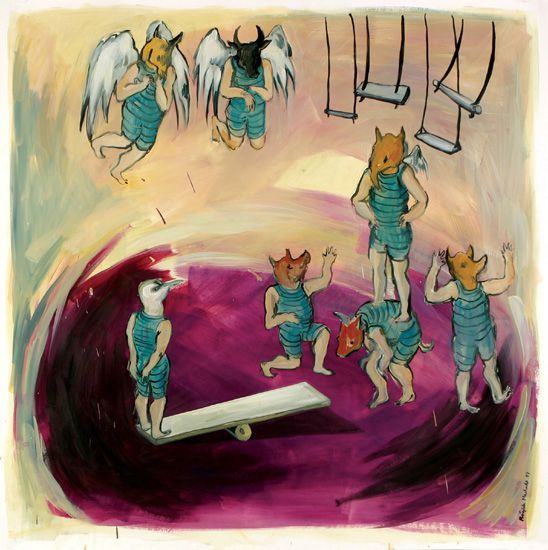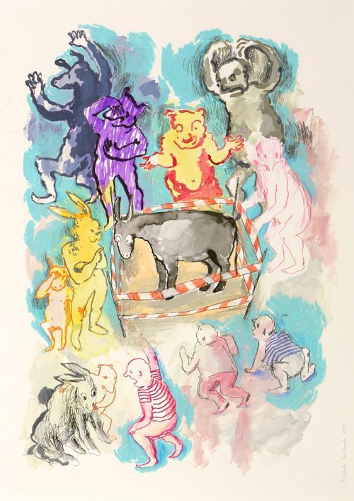 «Enchanting and surreal creatures, sometimes derisive, come together in painting. They offer themselves up to voyeurism. Each one has its own character and style, and each one interacts with the other, at a safe distance, in an animal network. "Painting after observing".
