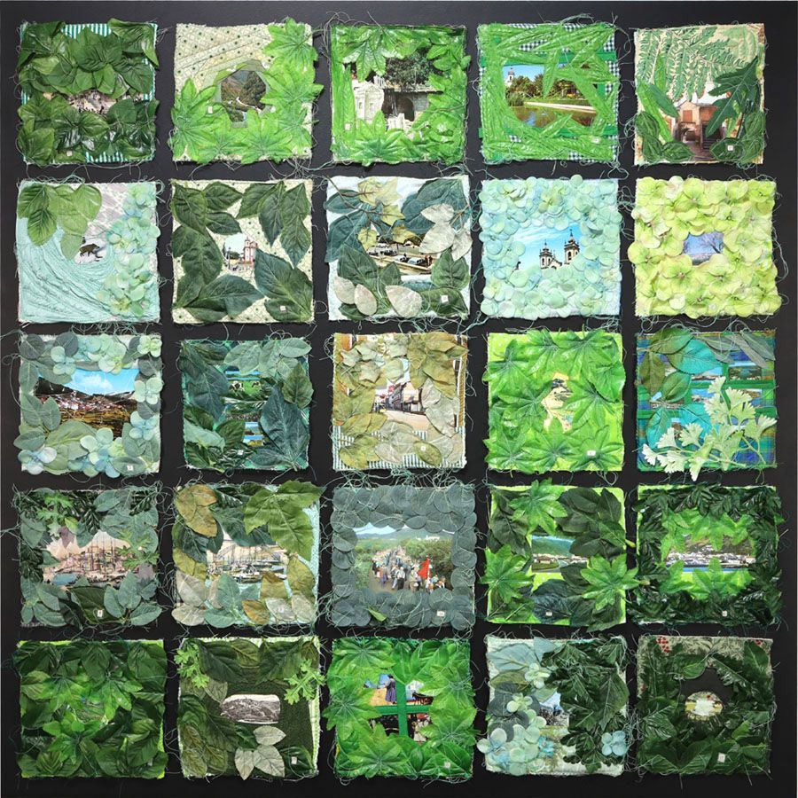 HOPE 51 | 2024 | tecidos folhas artificiais, postais ilustrados, linhas / artificial leaves, picture postcards, threads | 107x107 cm