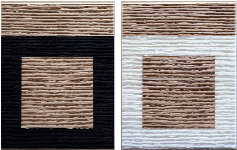 Duas estruturas branca e preta sobre cânhamo / Two black and white structures on hemp | 2024 | papel canson rasgado à mão e colado s/tela / canson paper hand torn paper and pasted on canvas | 116x178 cm (díptico)