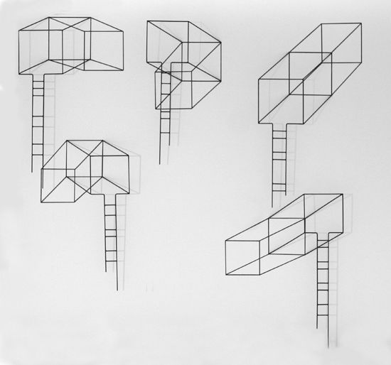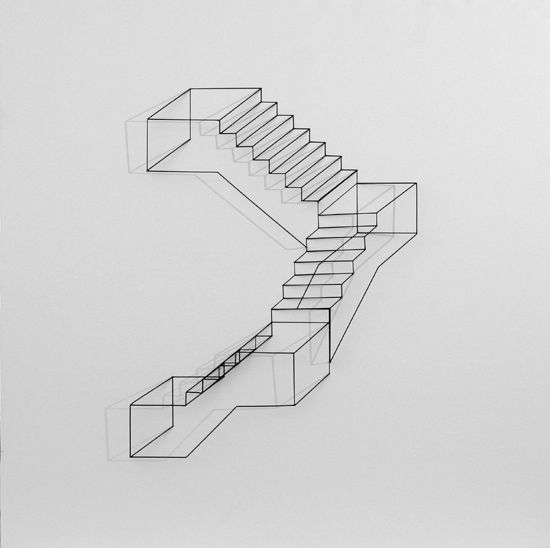 The architectonic space of his work is built by the thin line of black painted metal which is projected in the support and is extended through another line from the same thickness, drawn in Indian ink at the surface. When the form, which is perpendicularly fixed to the basis, receives the light, it throws its shade to the brightness of the background, creating mixed perspectives and acting as if the vision was multiplied.