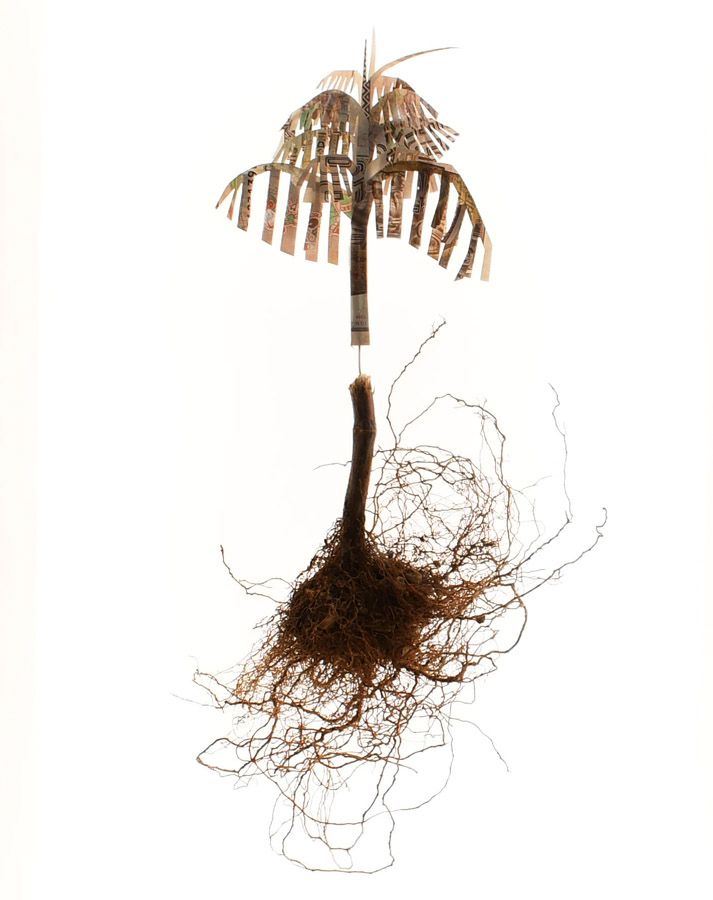 Nota - Guatemala, palma africana. 50 centavos de quetzal, 1998 | 2016 | técnica mista, nota e raiz | 34x21x13 cm